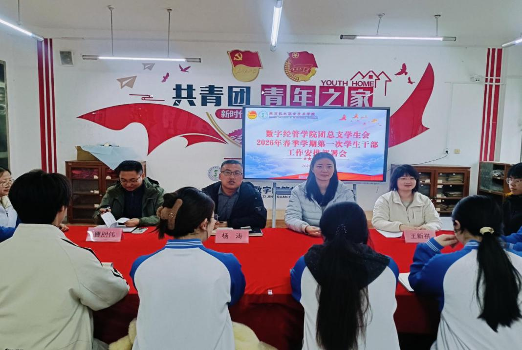 为进一步加强团学干部队伍建设,明确新学期工作任务,强化责任担当与作风建设。2026年3月4日下午,数字经管学院团总支学生会2026年春季学期工作安排部署会在青年之家召开。 学院学工办主任、团总支书记杨涛,团总支副书记、专职辅导员李铭萱,团总支兼职副书记曹朋伟、王新祺及学院全体团学干部参加会议。