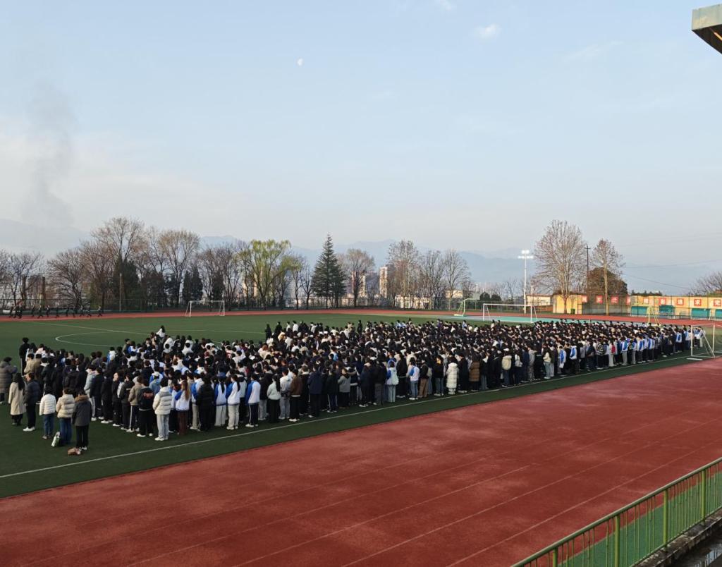 清晨的校园,阳光和煦,全体师生列队整齐、精神饱满,现场庄严肃穆。伴随着雄壮的《义勇军进行曲》,五星红旗冉冉升起,全体师生肃立致敬、齐声高唱国歌,目光坚定、神情庄重,尽显新时代青年学子的昂扬风貌与深厚爱国情怀。